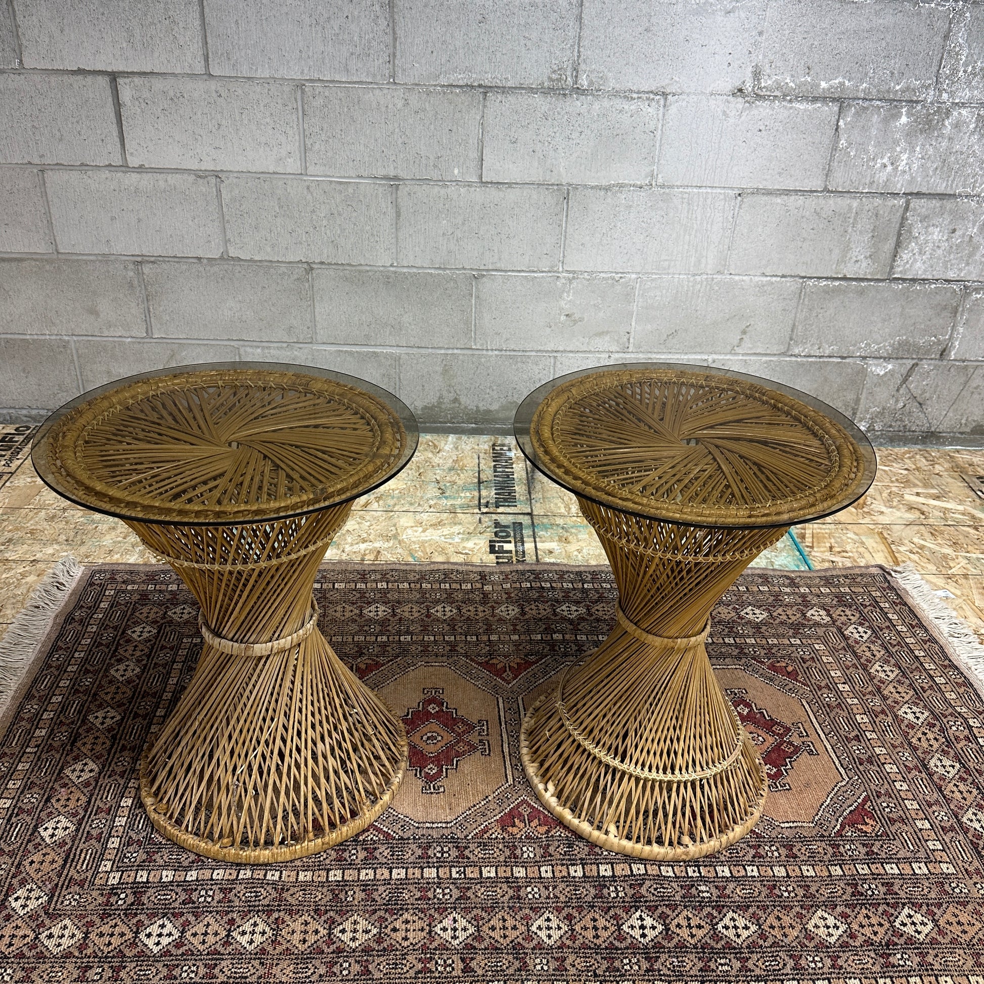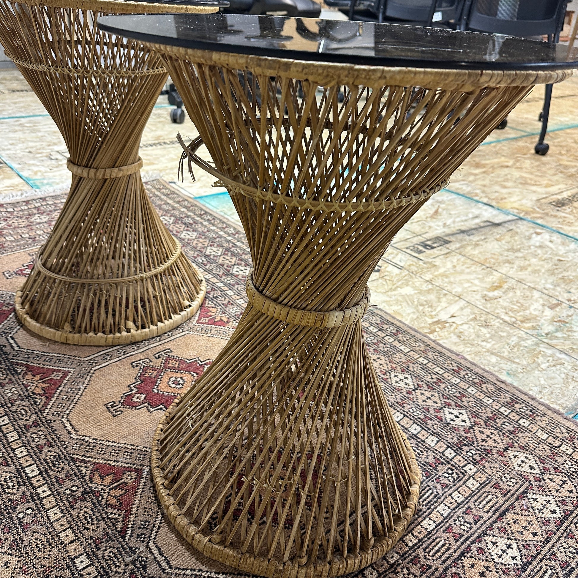 Round wicker side tables with smoked glass. Removable glass on top. Cosmetic age details seen in the pictures.