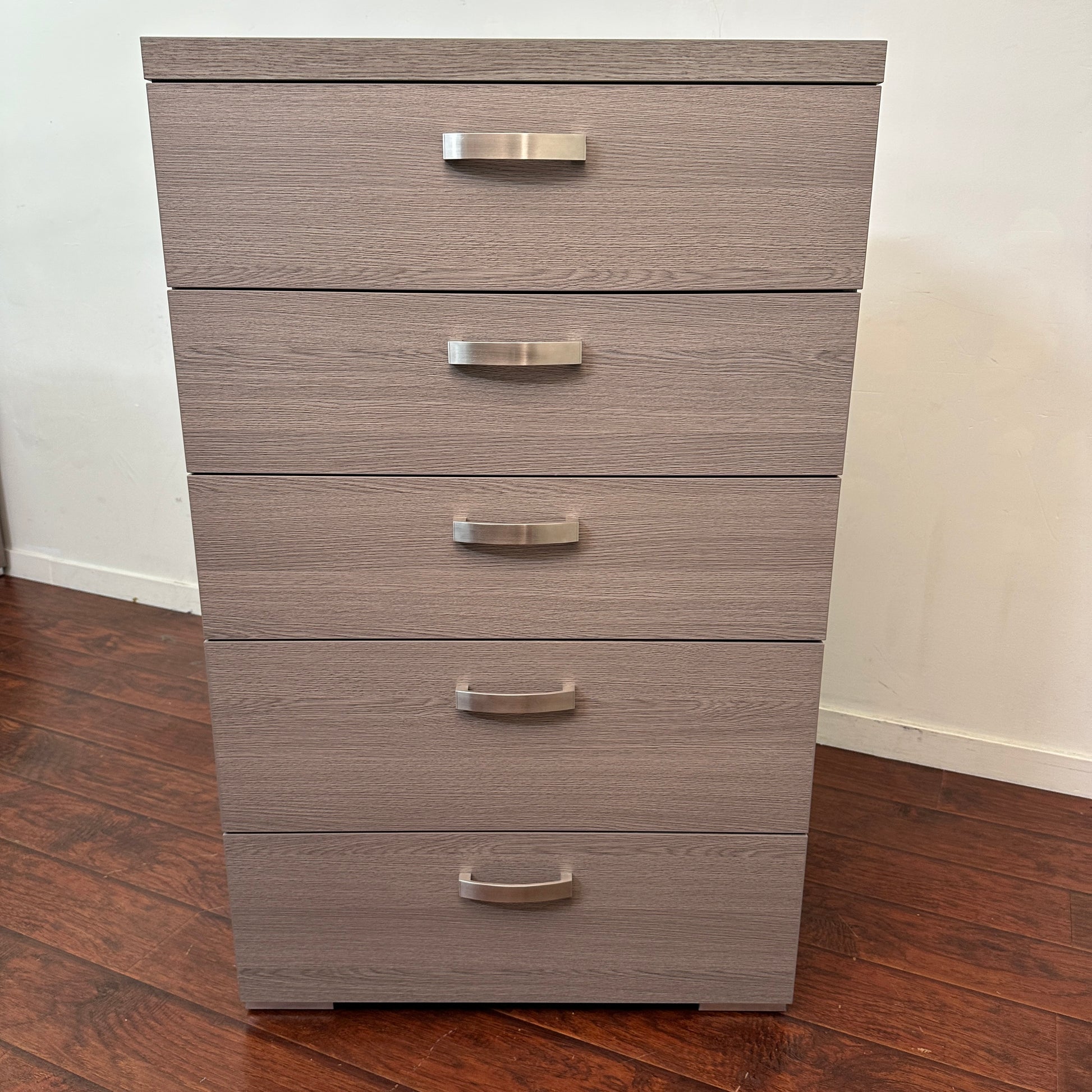 Modern highboy 5 drawers dresser and 2 nightstands in like new condition. All clean and ready to go. All drawers working fine. Sleek storage with urban edge.