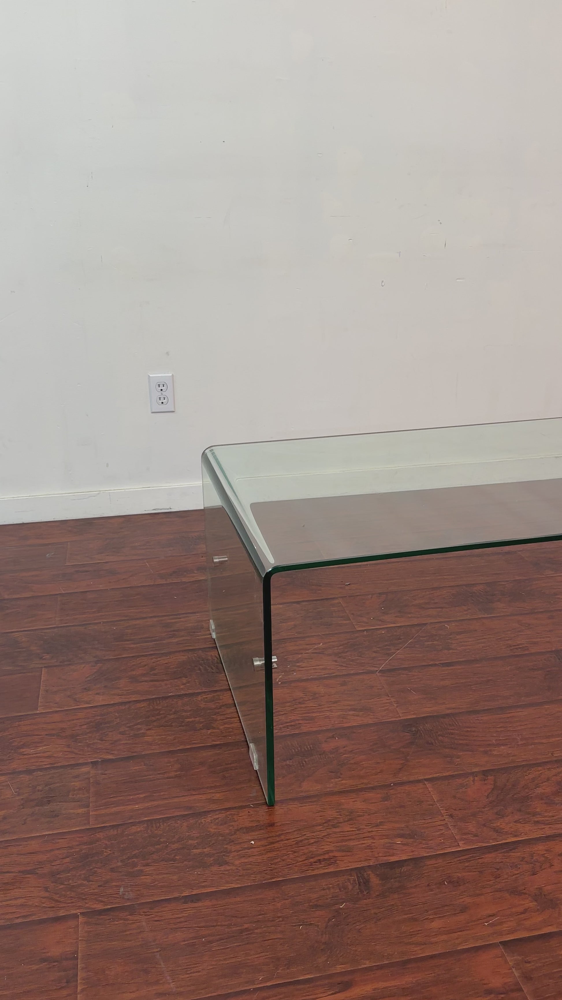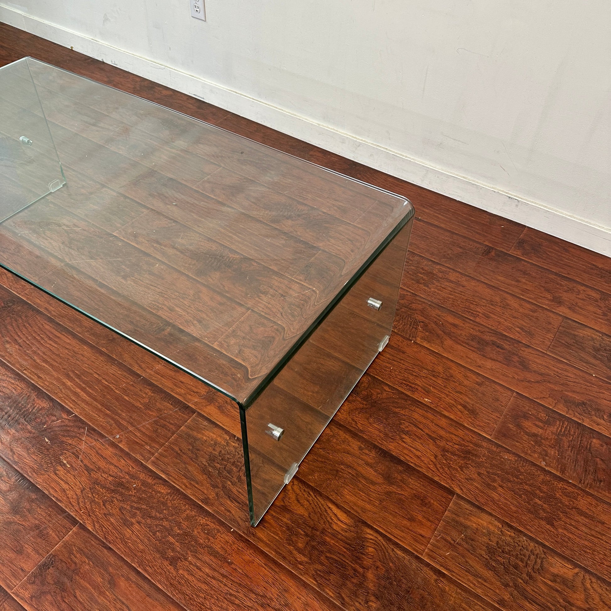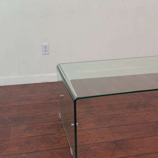 Bent glass coffee table in good condition. Small cosmetic detail on the leg - seen in pictures. Missing the second glass tier, but can be used normally.