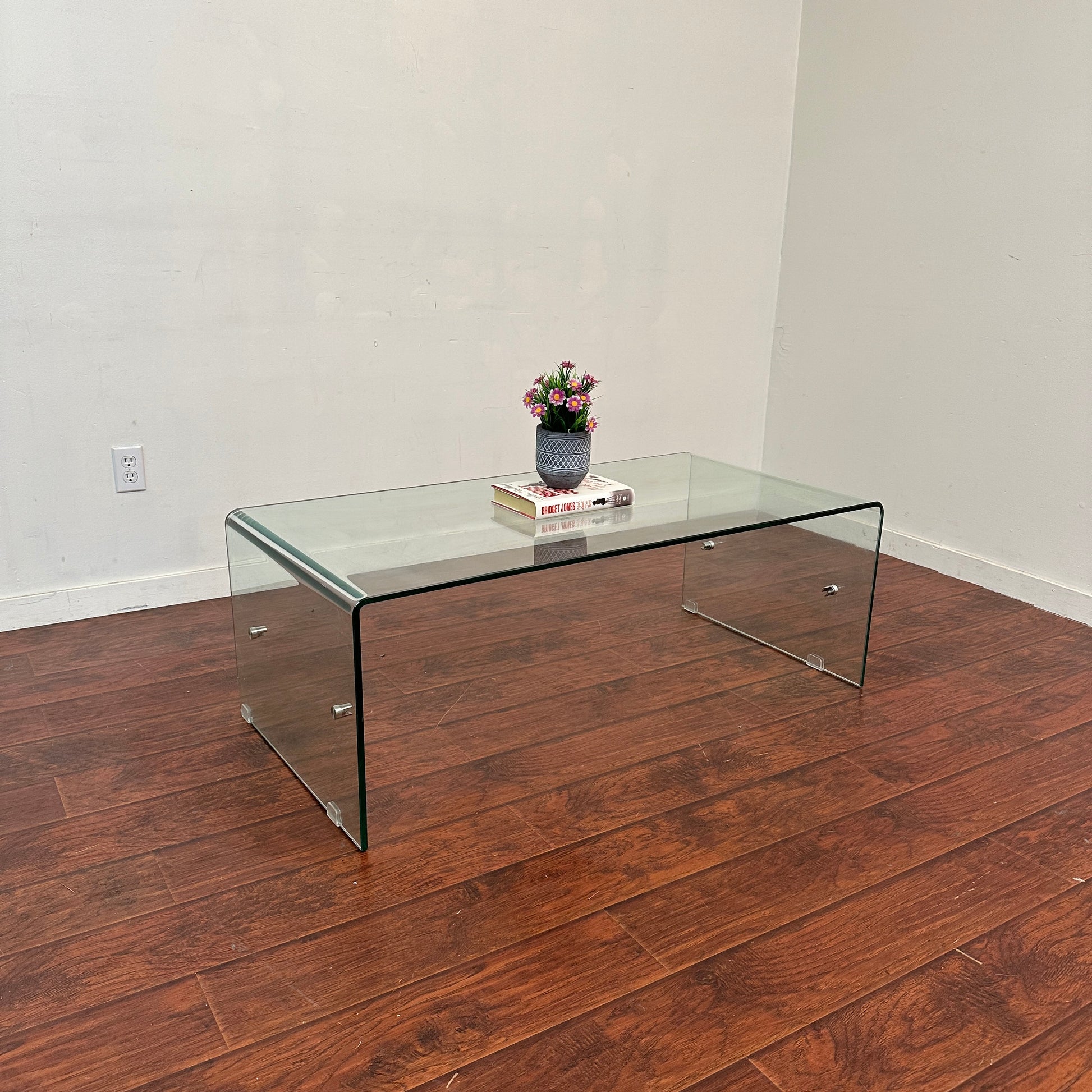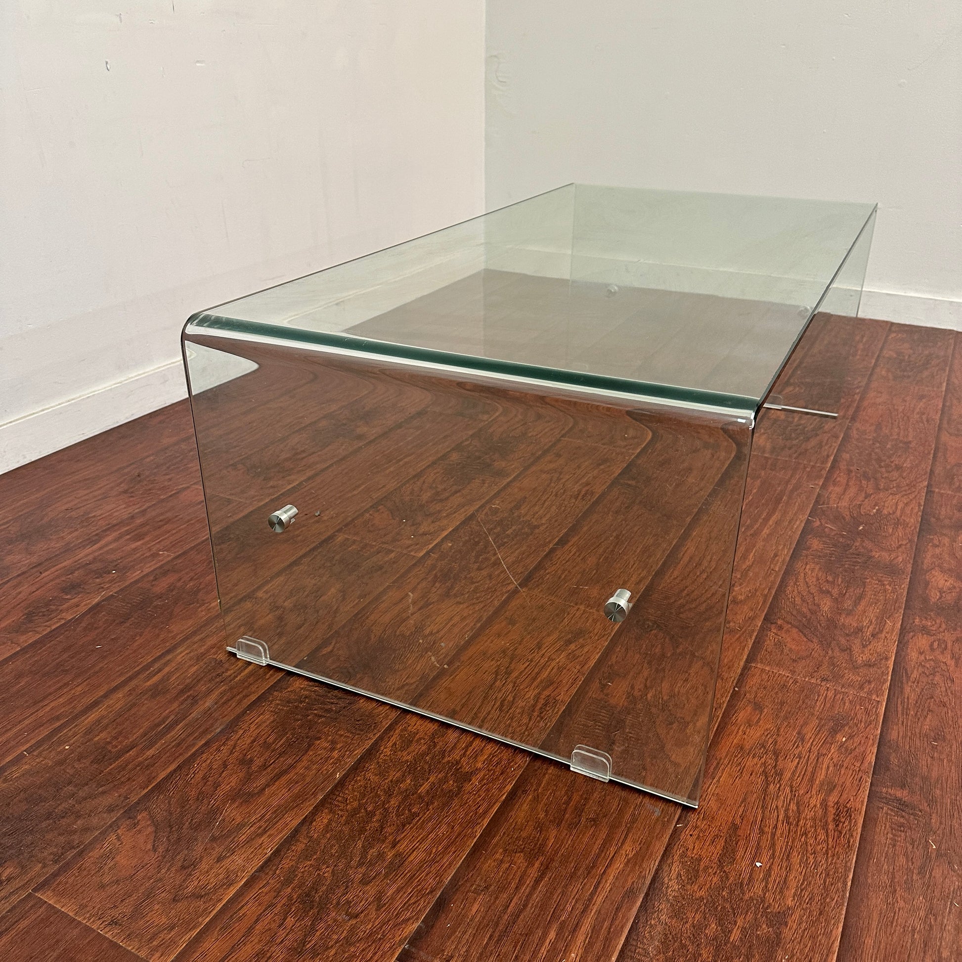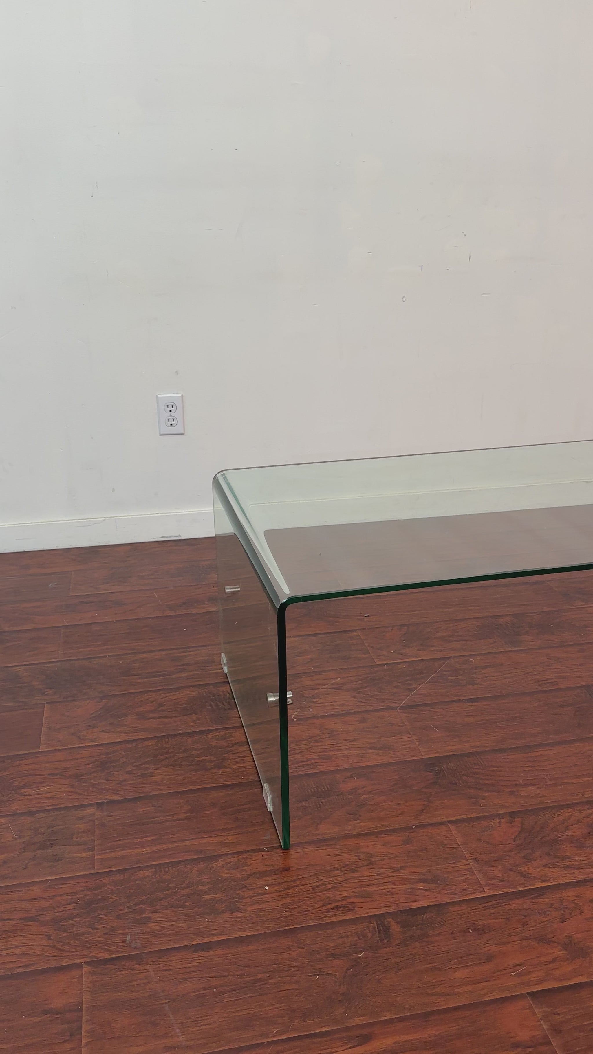 Bent glass coffee table in good condition. Small cosmetic detail on the leg - seen in pictures. Missing the second glass tier, but can be used normally.