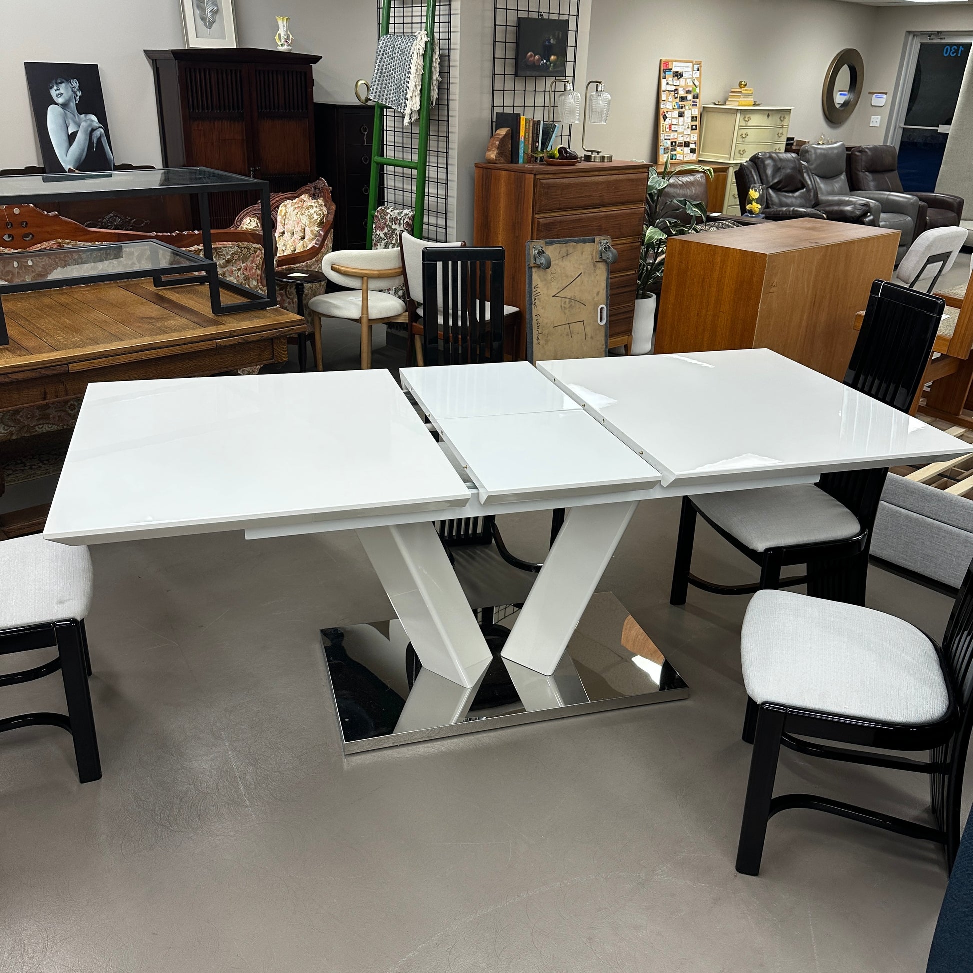 High-end white dining table with butterfly leaf in very good condition. Small cosmetic detail on top which can be seen in the pictures. Top of the table can be detached. Dining chairs in good condition with Italian design look.