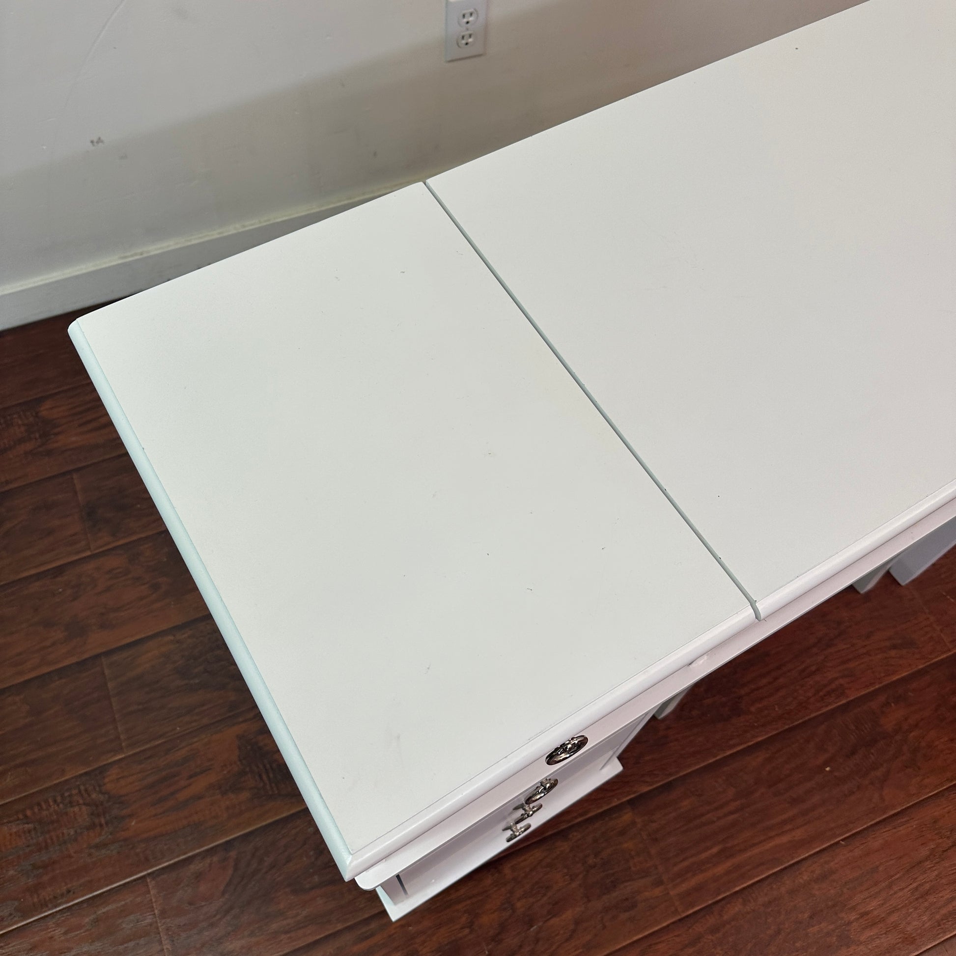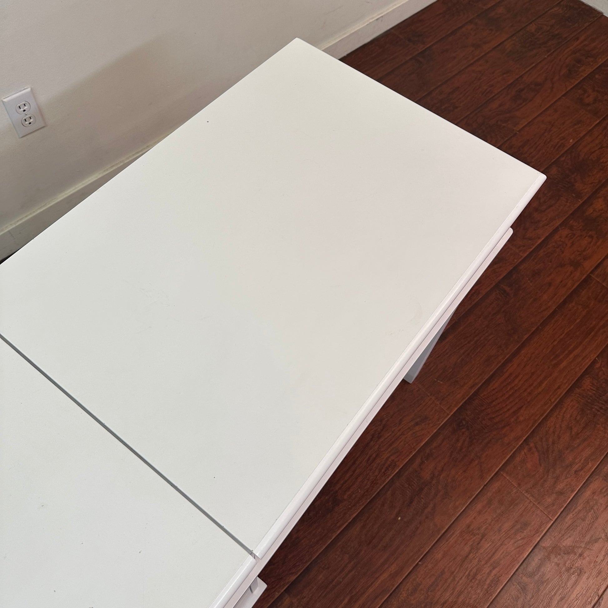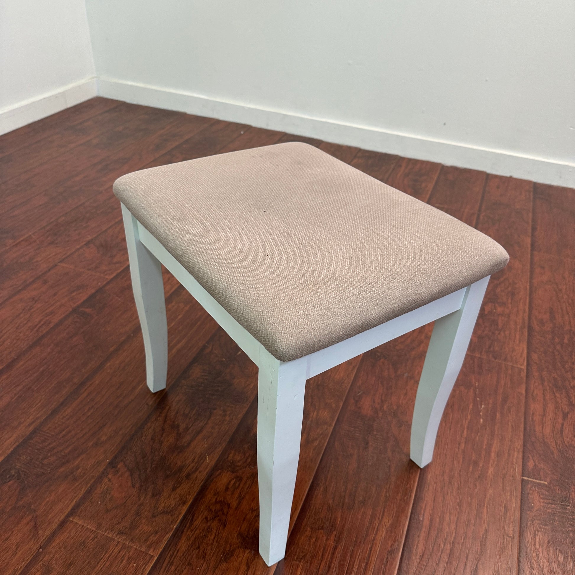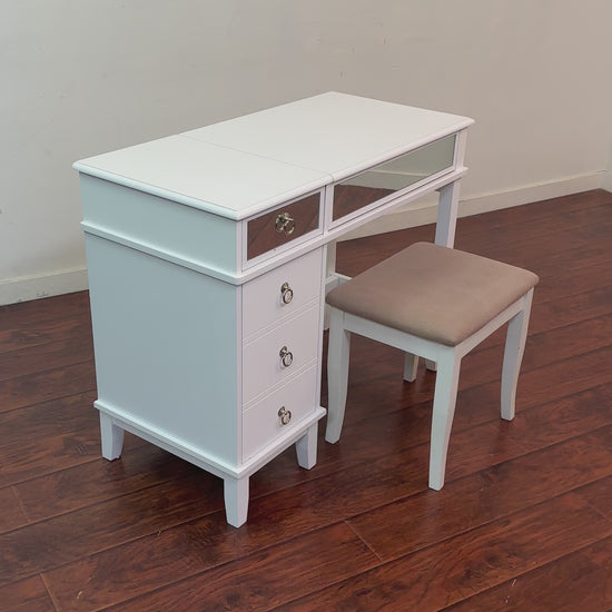 White vanity table with stool in good condition. Table opening normally. Stool fits into the table.