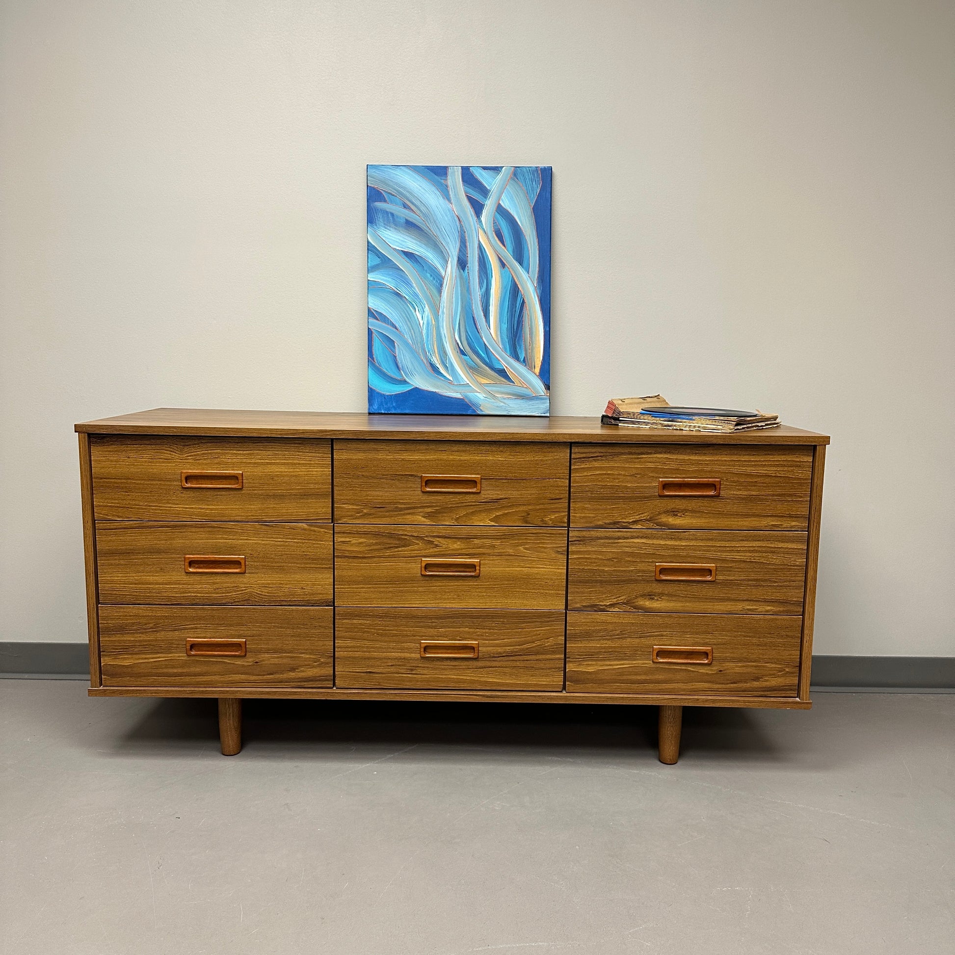 Mid-century nine drawers dresser in good condition. Nice and clean. Not solid wood. Mid-century and Danish style.