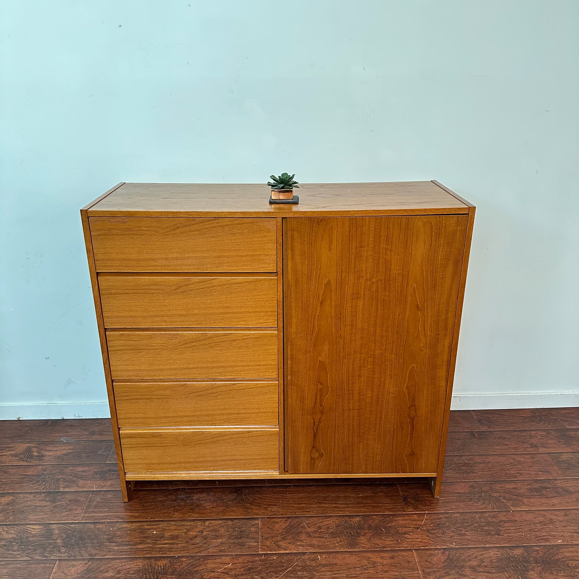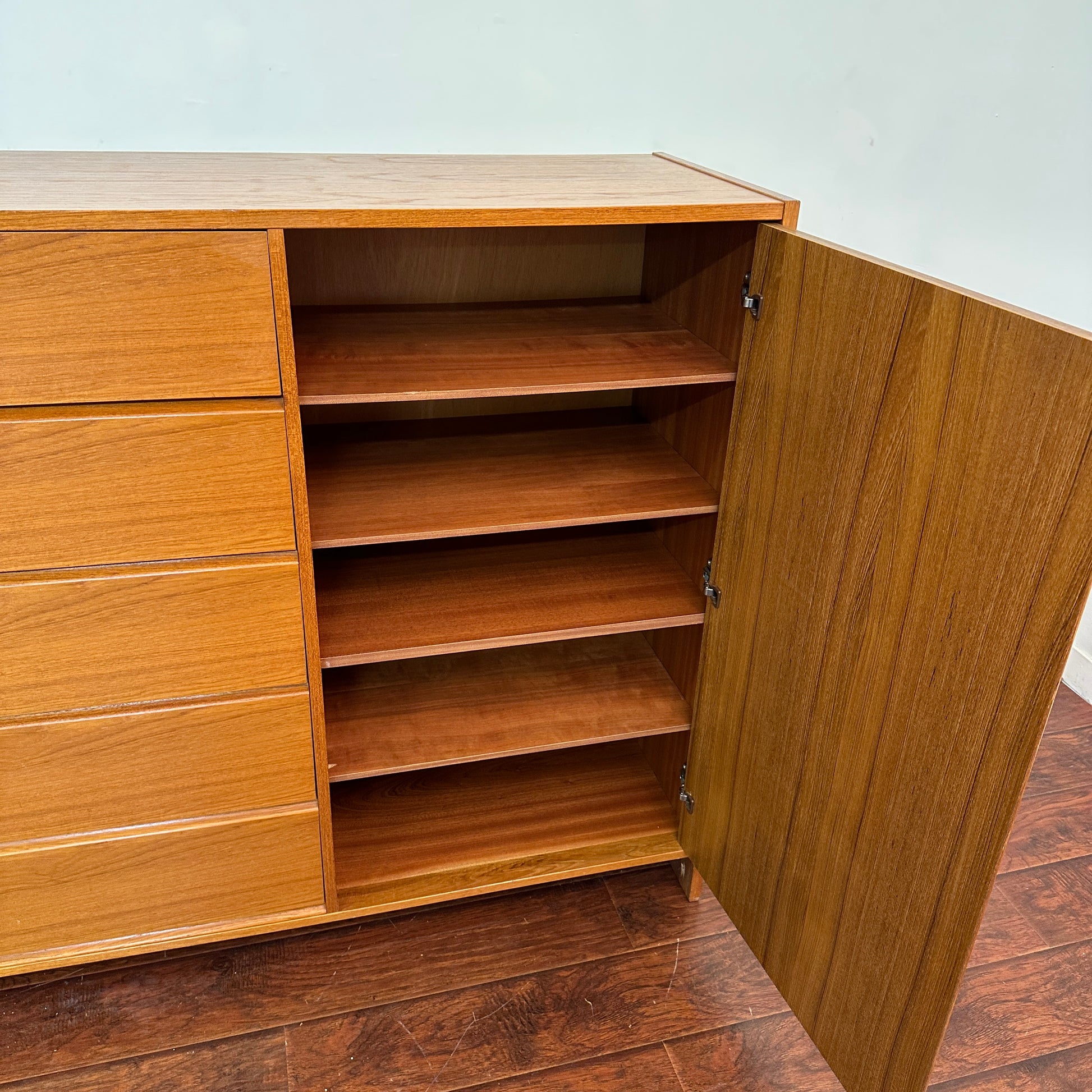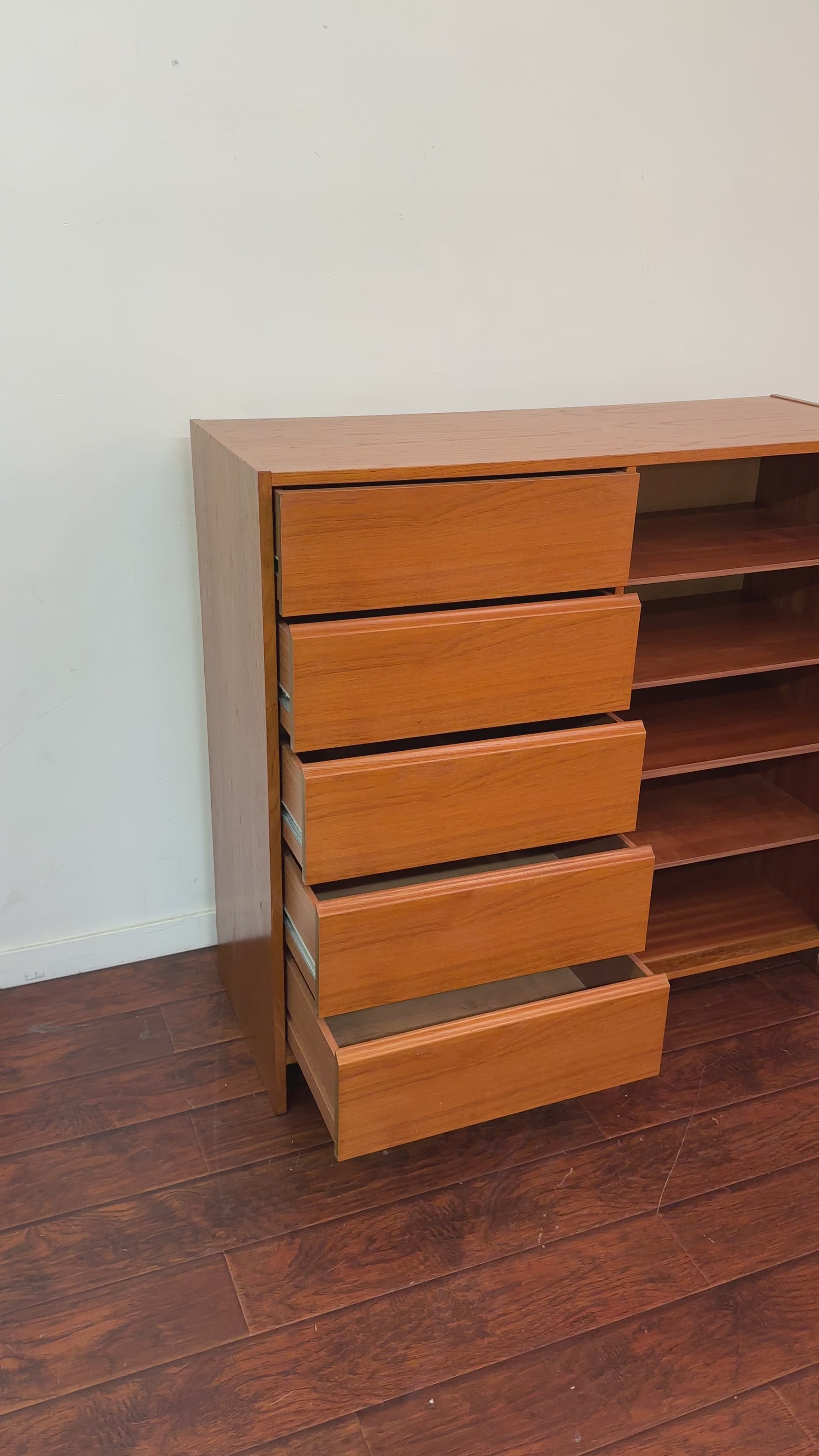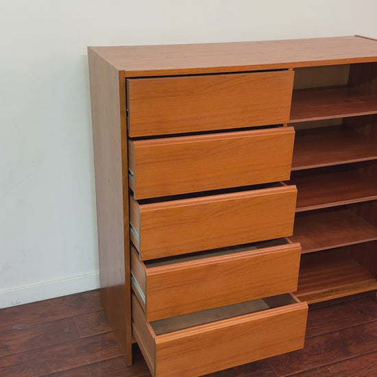 Vintage mid century danish cabinet in great condition. All 5 drawers working fine and adjustable shelves inside. Not solid teak wood.