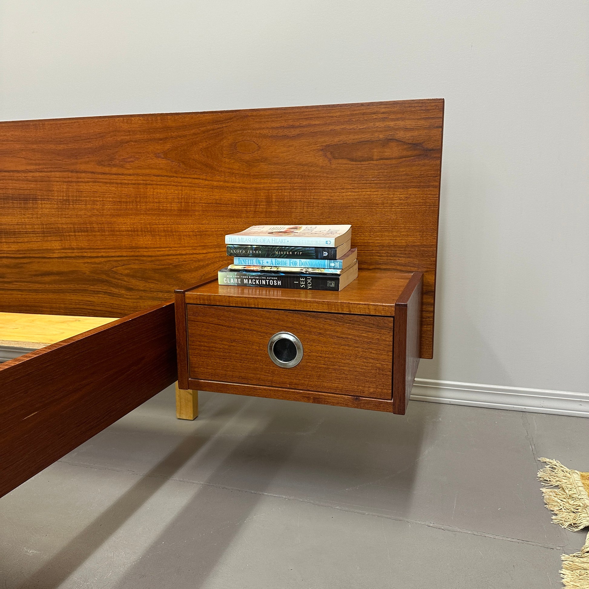 Bed with floating nightstands in beautiful mint condition. Scent-free. Easy to put together. Not solid teak. Queen size.
