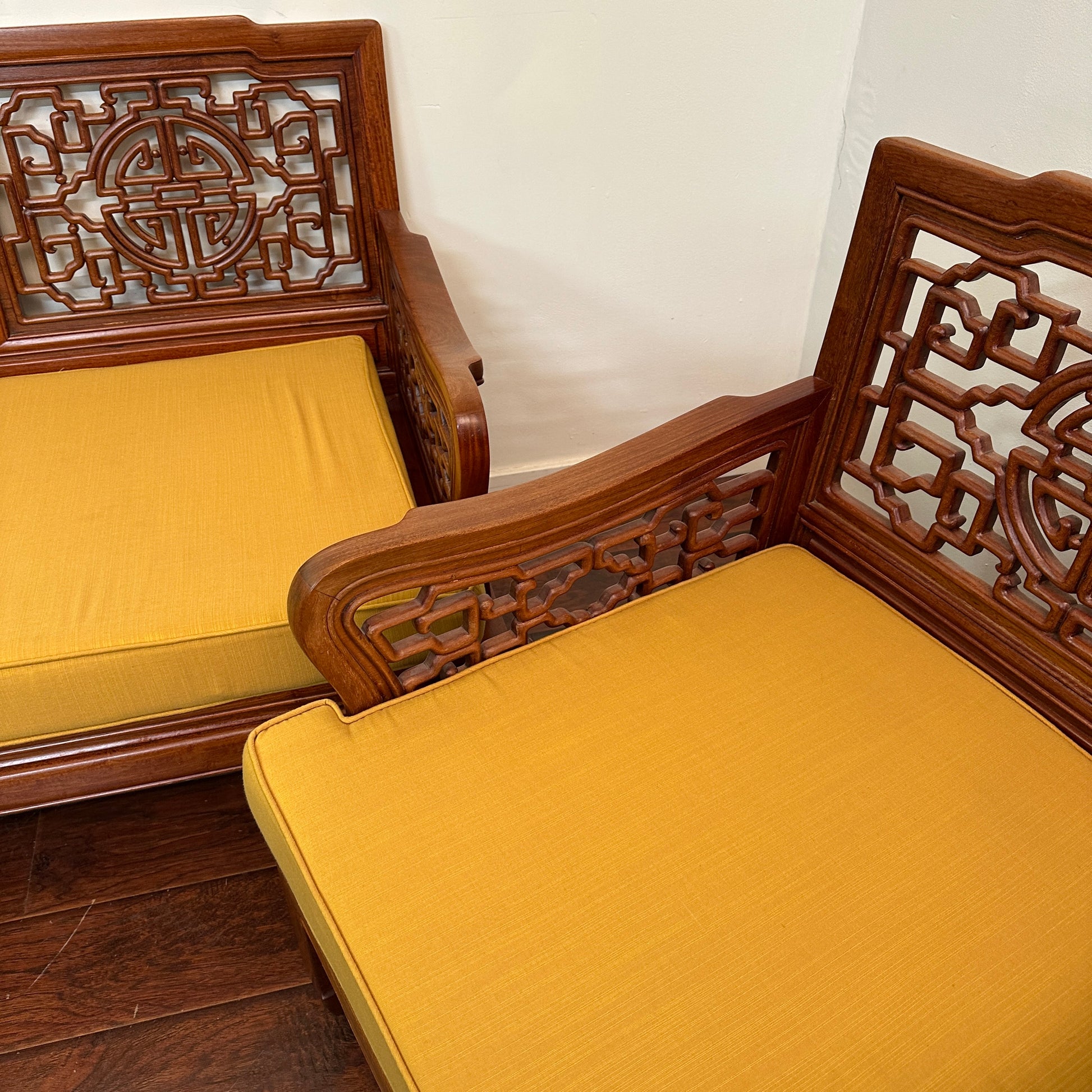 Asian Ming style sofa and 2 accent chairs in great condition. Solid wood and well built. Carved wood with beautiful details. One of a kind pieces.