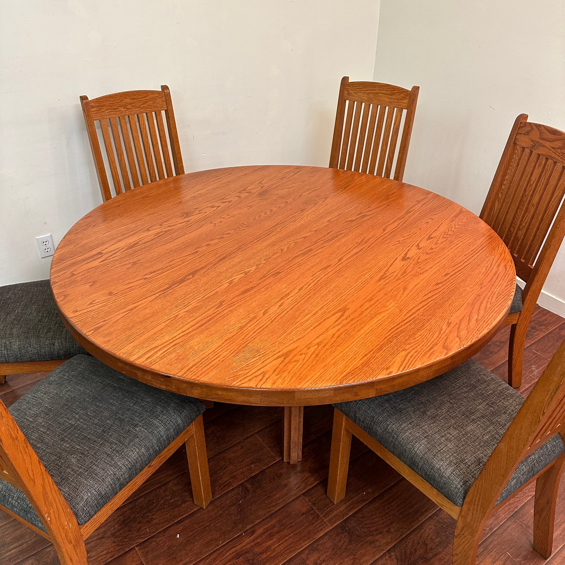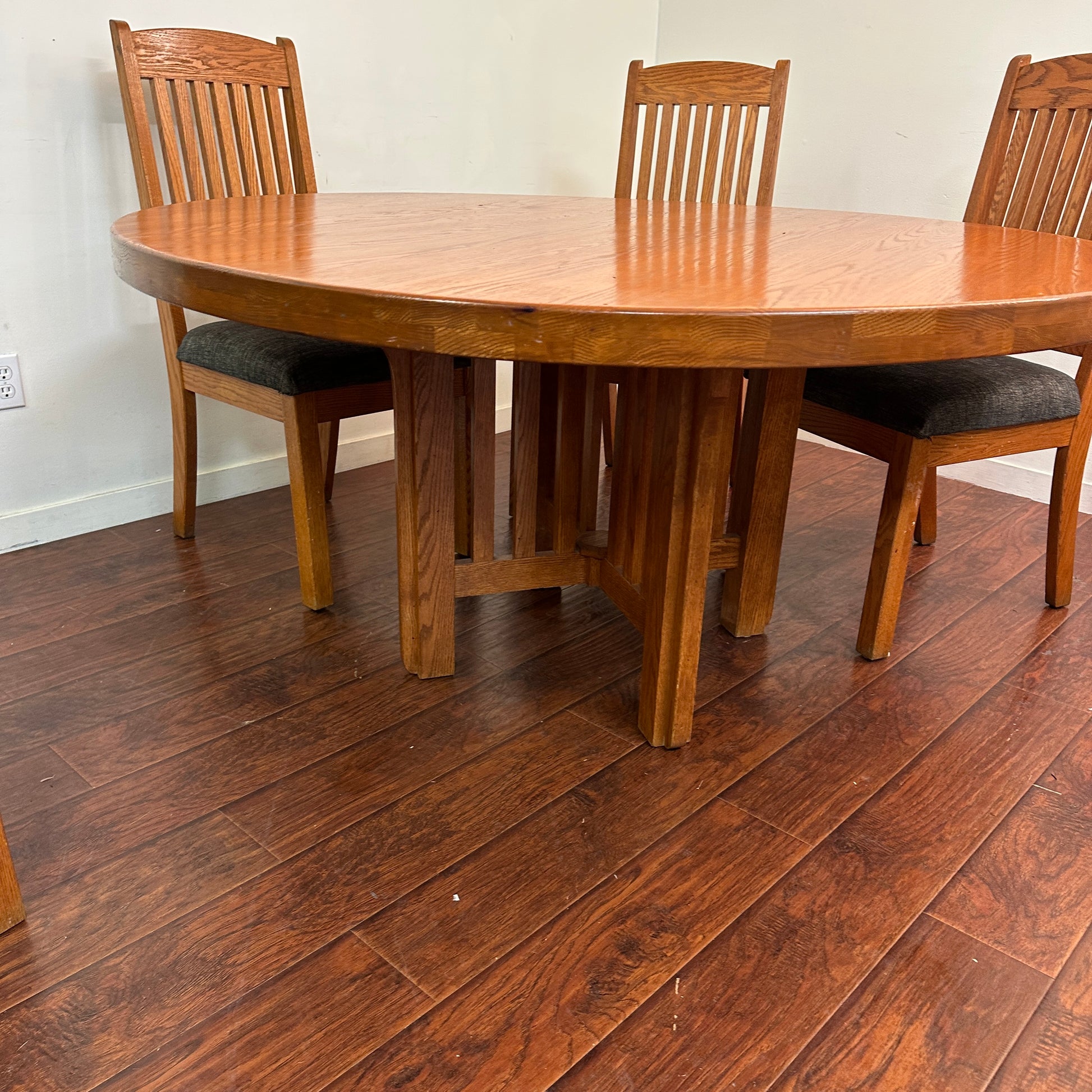 Mission style solid oak round dining table and 6 chairs in good condition. All chairs are solid and ready to go. Chairs have been upholstered.