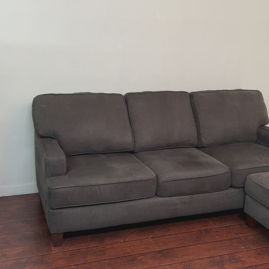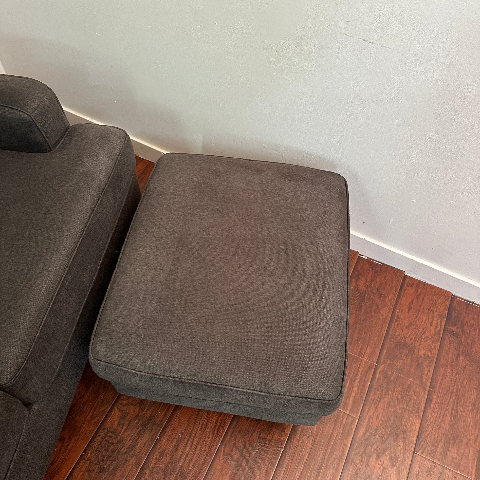 Dark grey reversible sectional in great condition. It has been shampooed, so it’s clean and ready to go. Seat cushions are removable. The ottoman can be positioned as desired, or the piece can be used as a standard three-seat sofa.