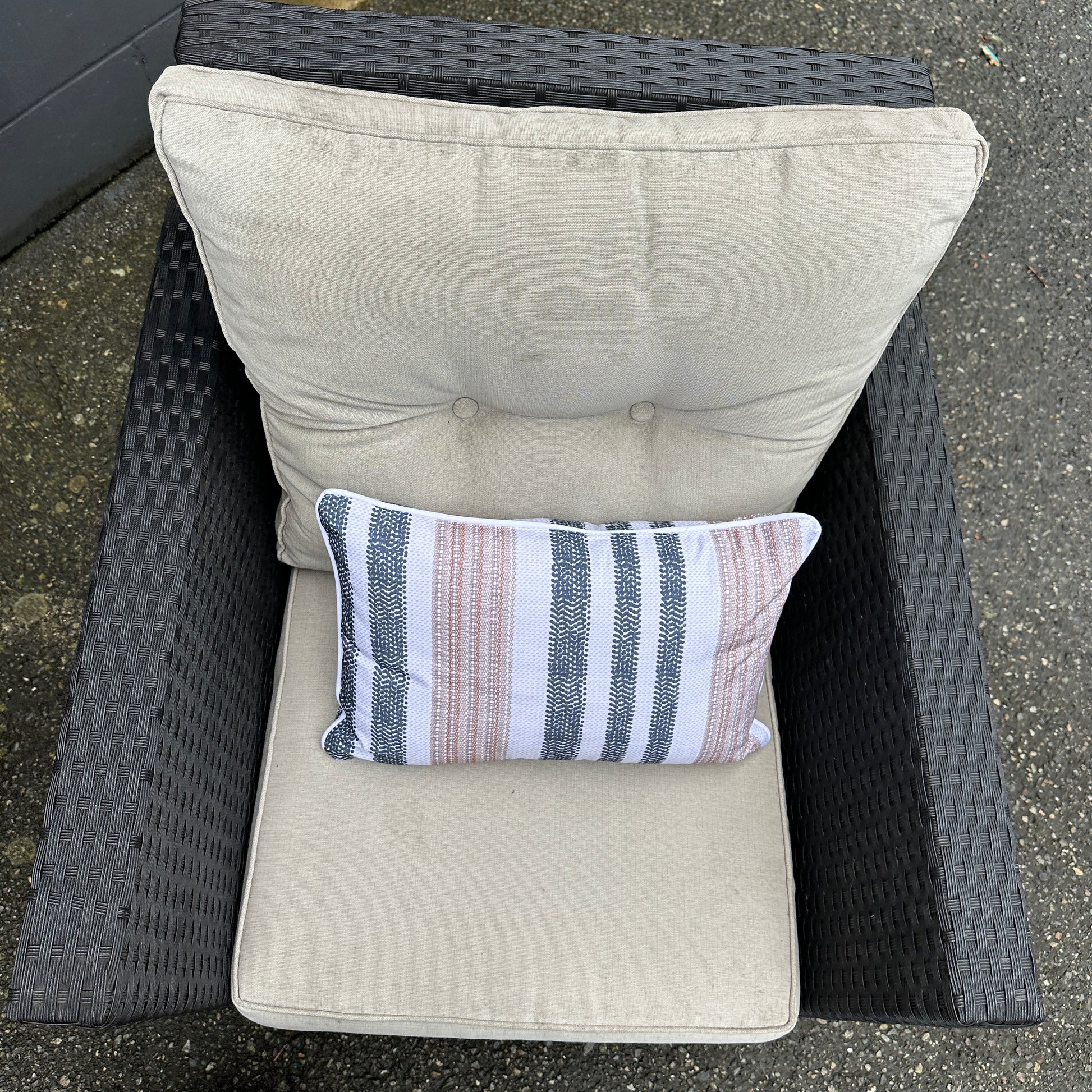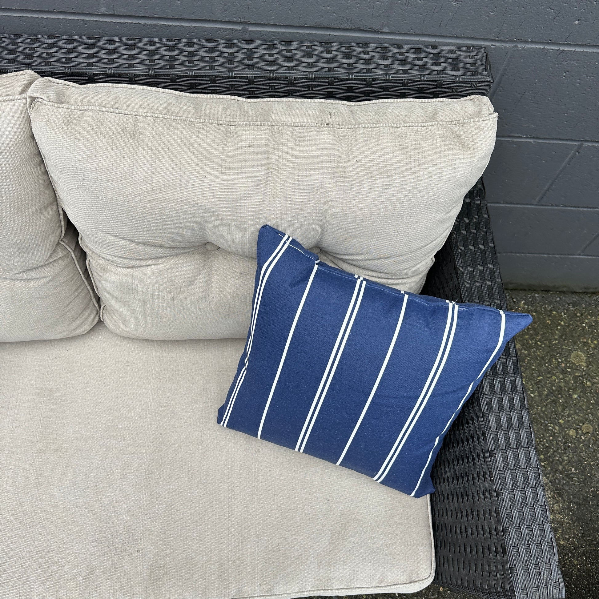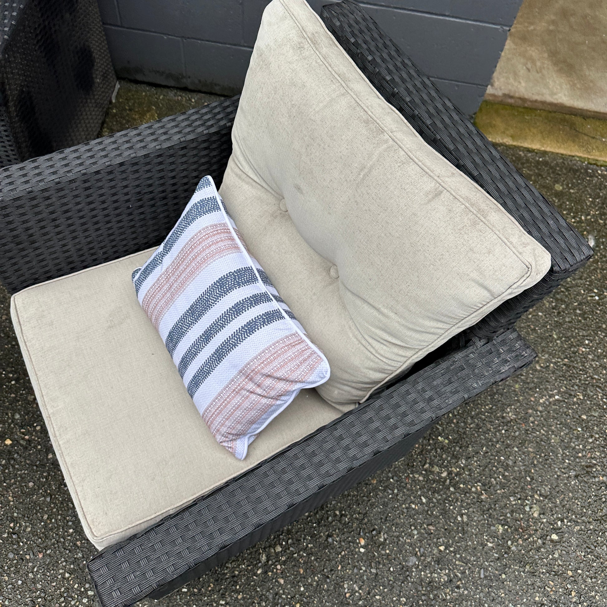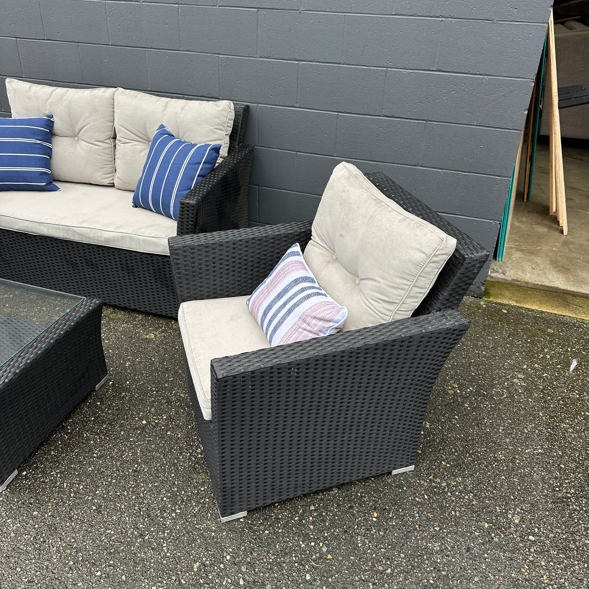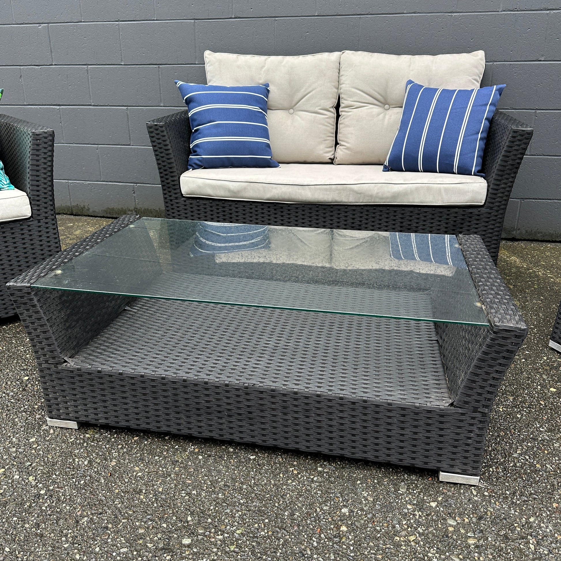 4 pieces patio wicker rattan patio set in good condition. Cushions are removable and machine washable. Love seat is 54''x28 3/4'' deep. Chairs are 30''x28 3/4''. Coffee table is 44''x23 1/2''.