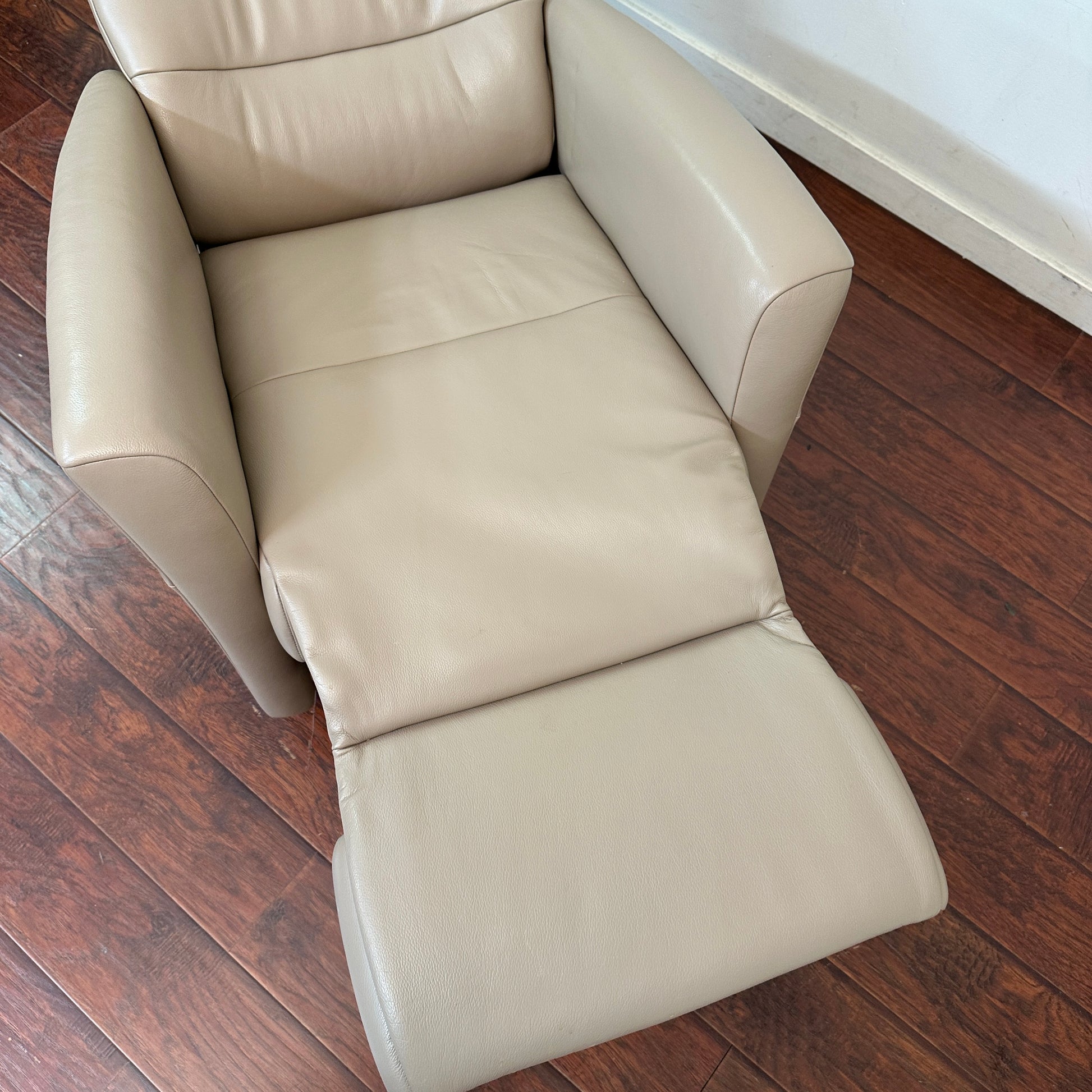 Like-new power recliner purchased from ScanDesigns in November 2024. Barely used, scent-free, and spotless. Full top-grain leather with adjustable backrest, lumbar support, heated seat, foldable footrest, 180° swivel, and optional gliding or rocking function. Includes an articulating headrest for added comfort.