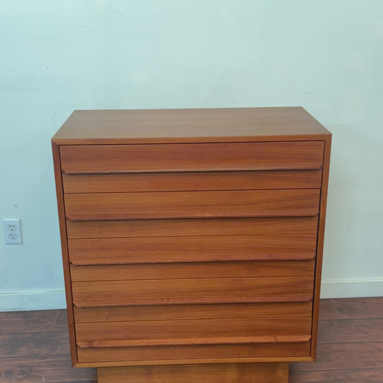 Mid-century vintage small highboy 5 drawers dresser. Not solid teak. Sleek handles. Scent-free. Some tiny cosmetic details and a bigger detail on the second drawer - seen in pictures.