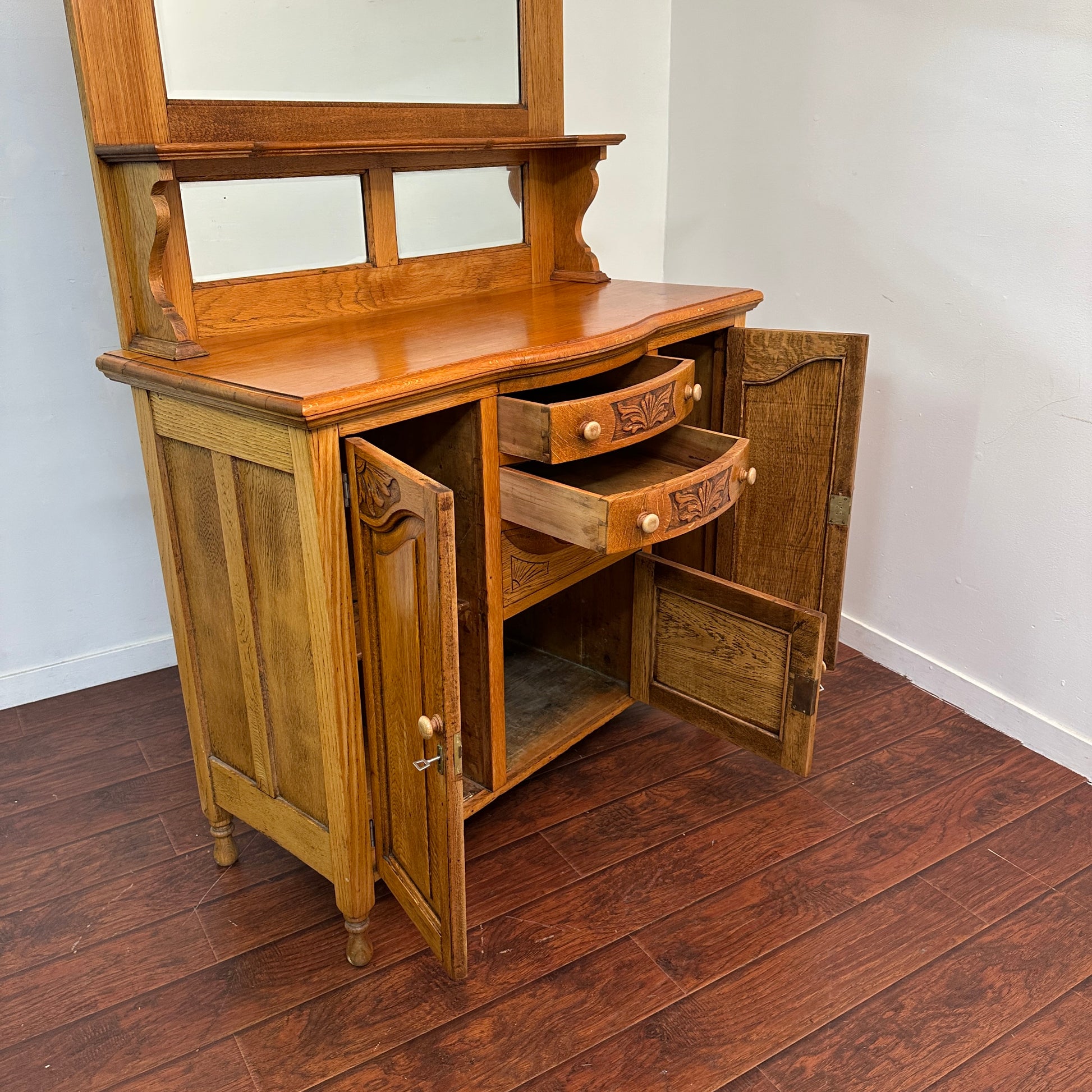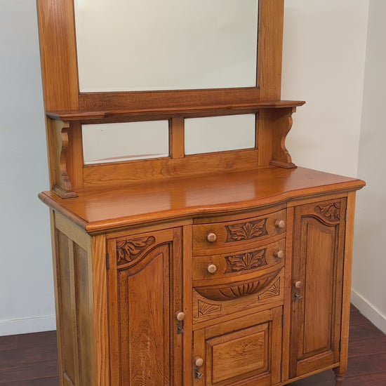 Victorian antique solid oak sideboard in really great condition. No damage - top is beautiful. Comes with 3 keys to lock the doors. Mirror can be removed. Carved wood around the piece. Check pictures. Unique piece of furniture - circa 1920s