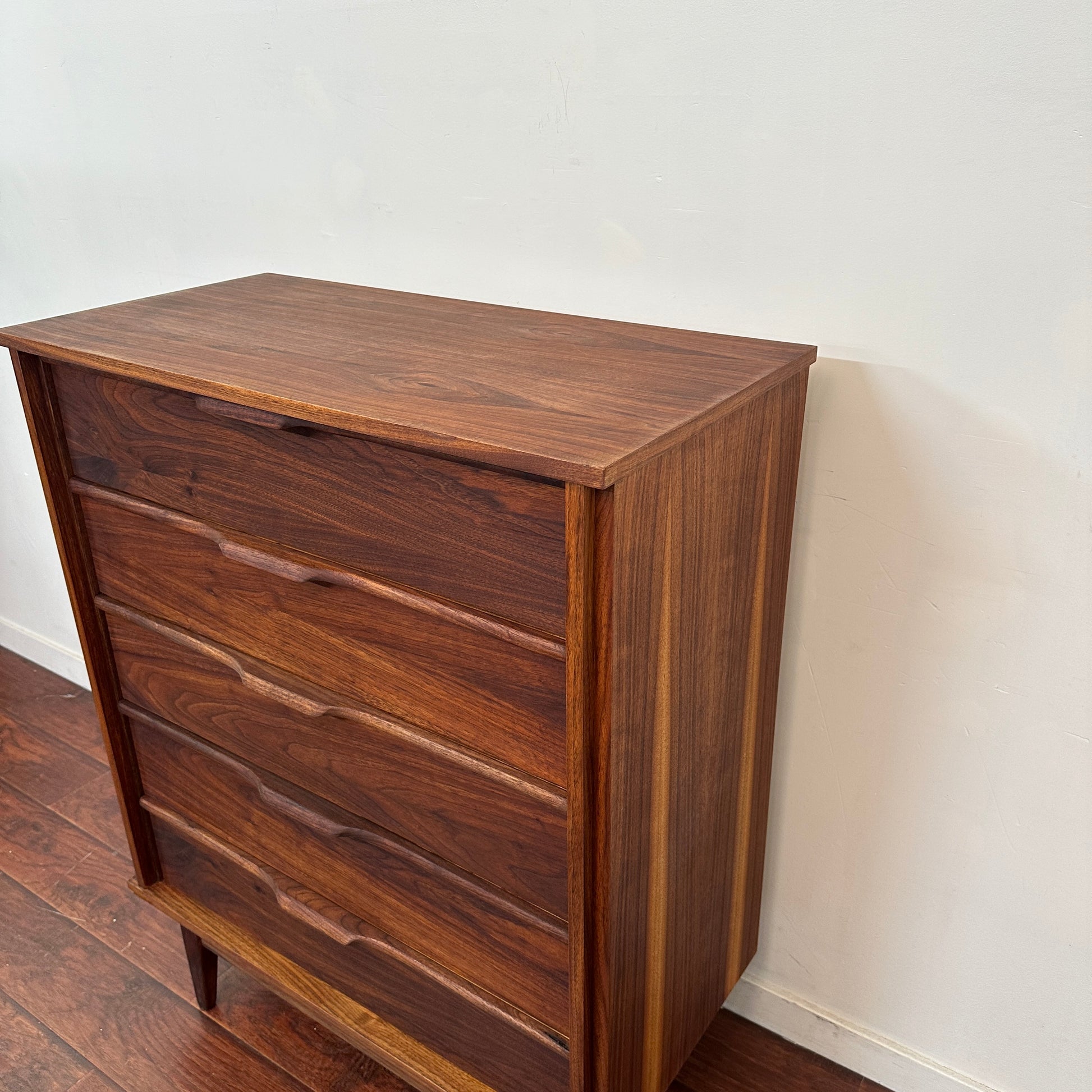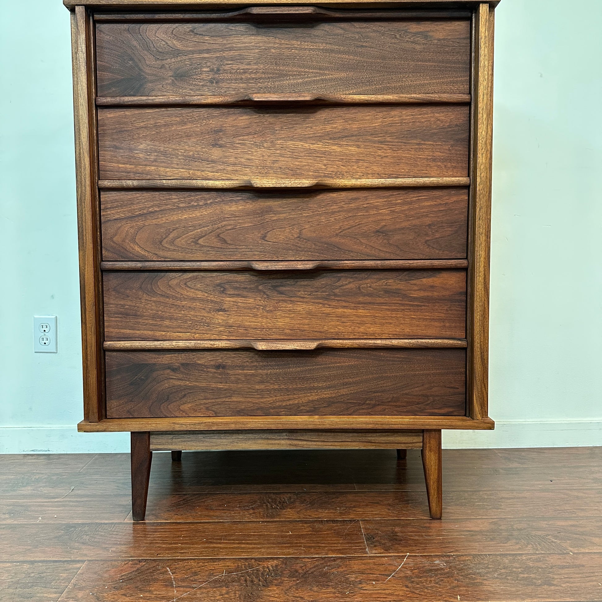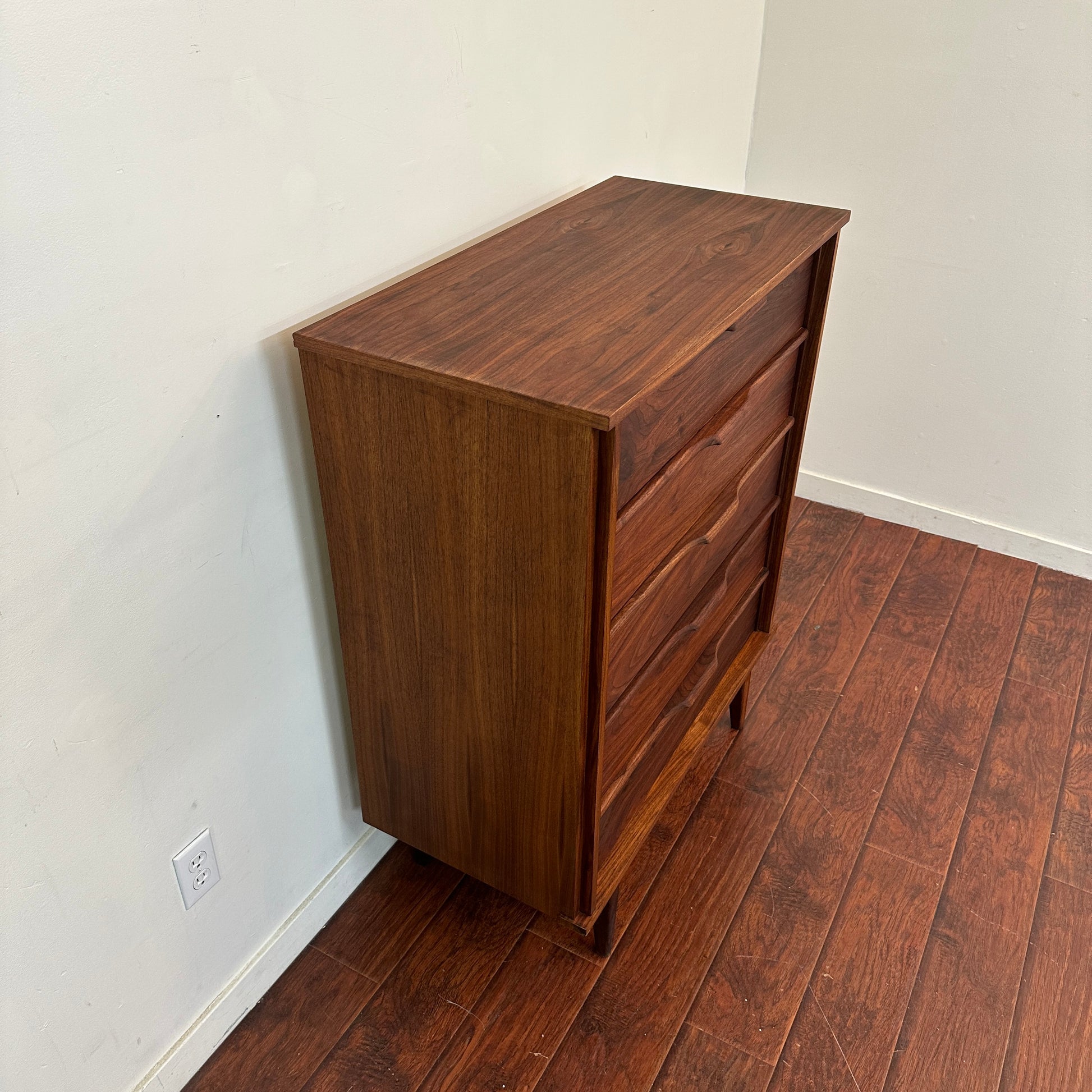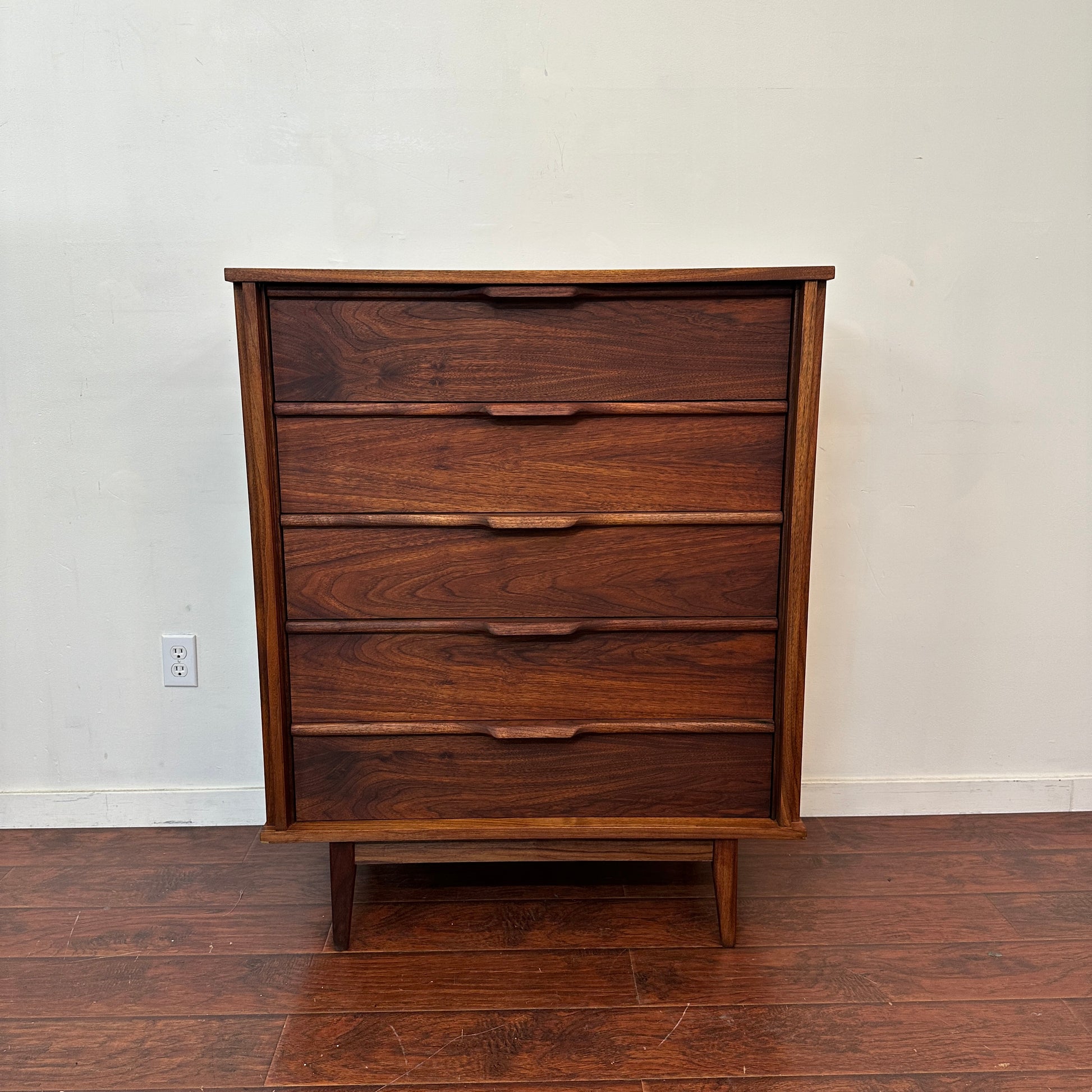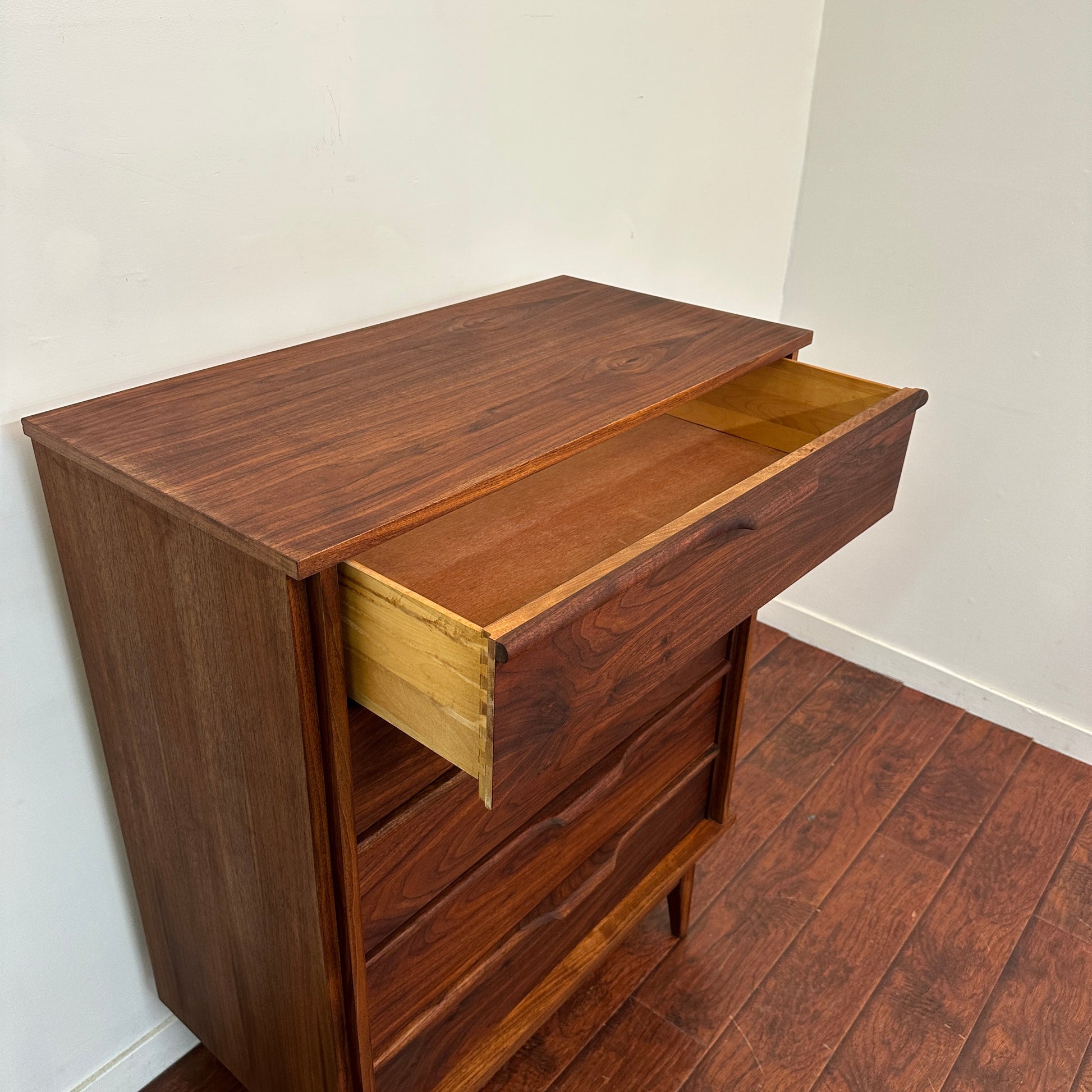 Mid-century vintage walnut highboy dresser by Princeville Furniture circa 1960s. Features five drawers with sleek handles. Mid century modern piece high quality built. Fully refinished - check pictures.