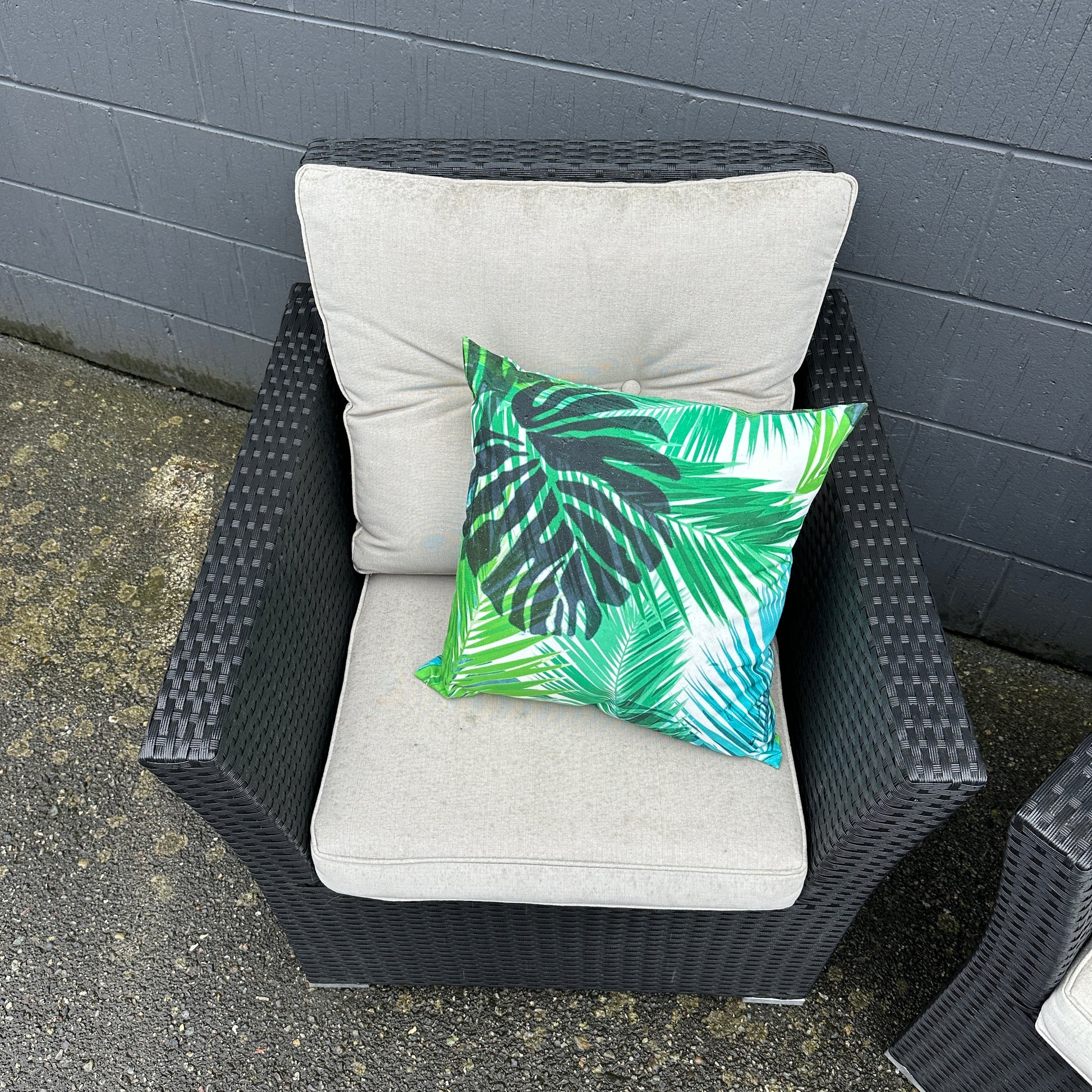 2 patio chairs with coffee table in good condition. Cushion covers can be removed and machine washed.. Chairs are 30''x28 3/4''. Coffee table is 44''x23 1/2''.