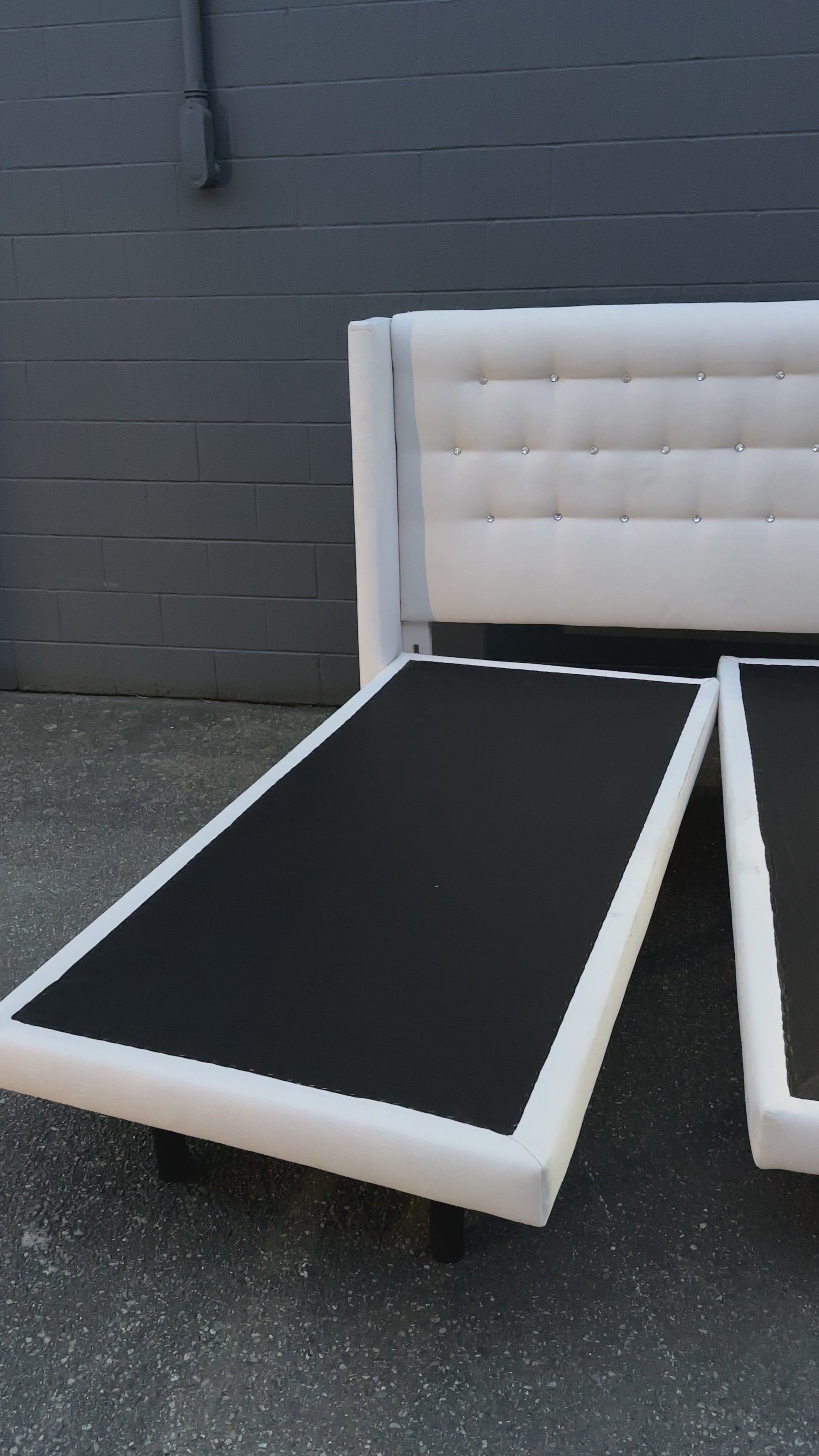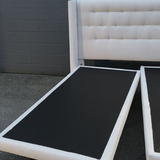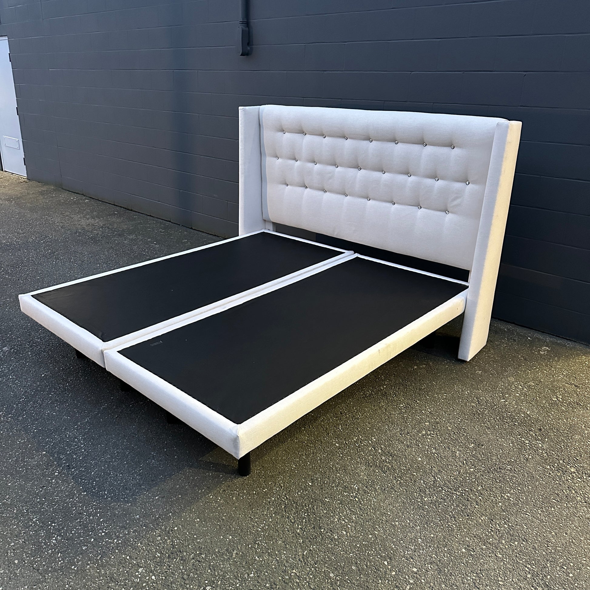 Tufted cream king size bed with headboard and two bases in good condition. Headboard is clean. Small rip on one of the sides of the bases which cannot be seen when covers are on top. Modern style. Legs from the base are removable.