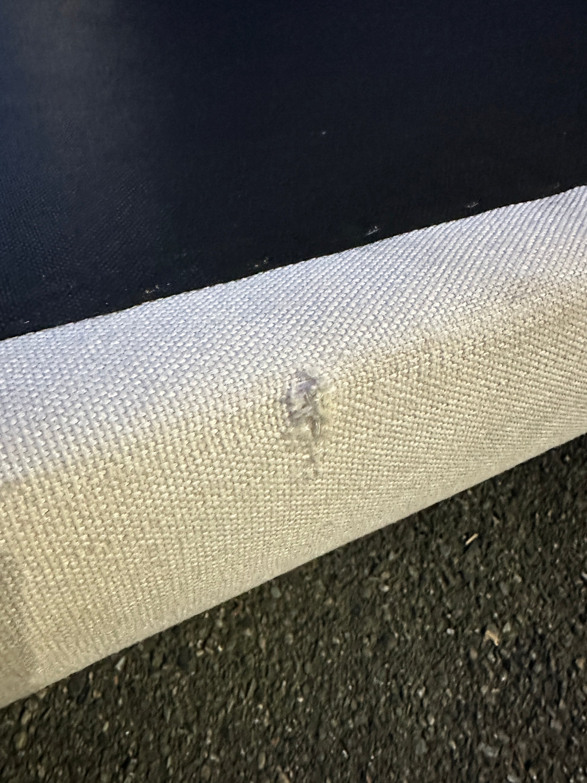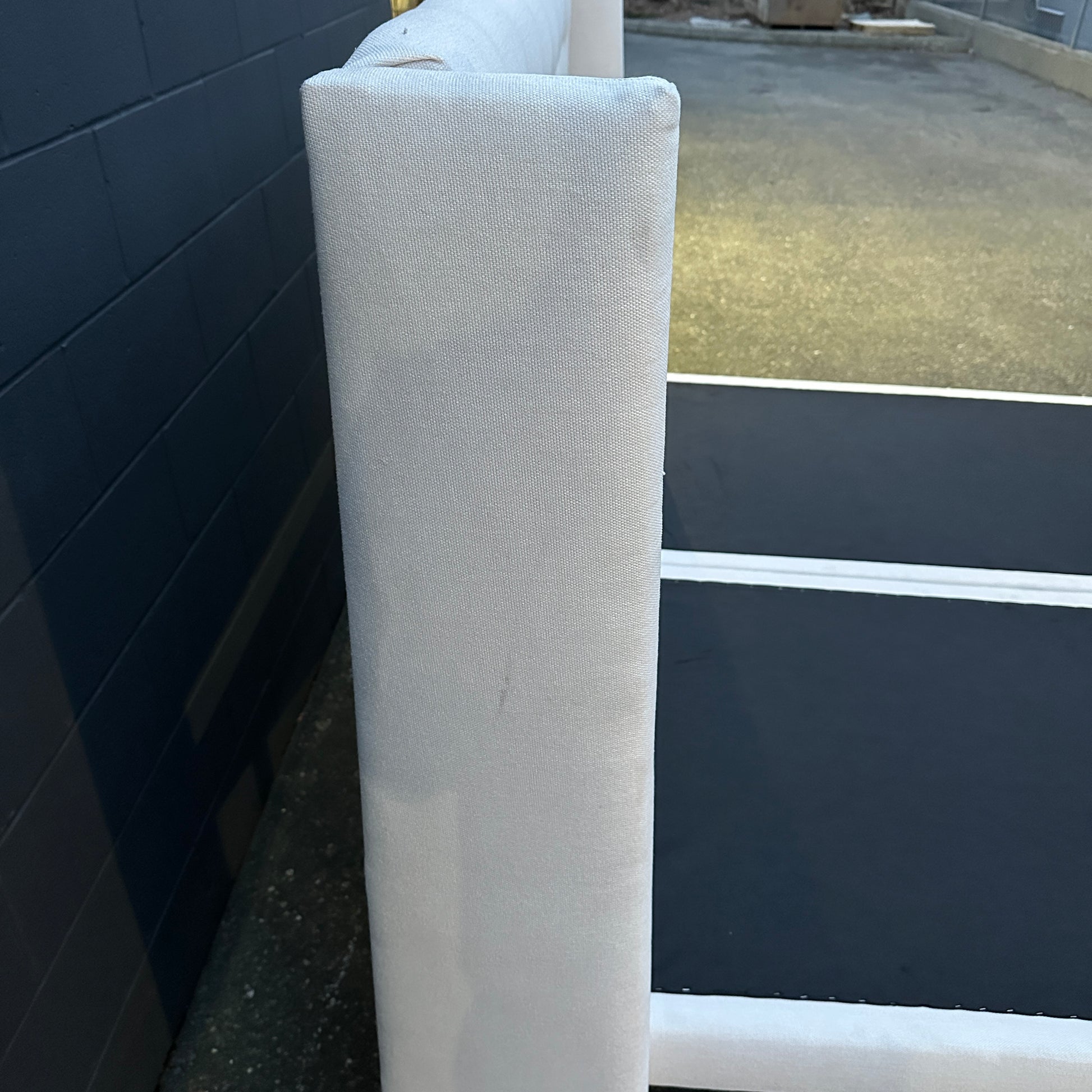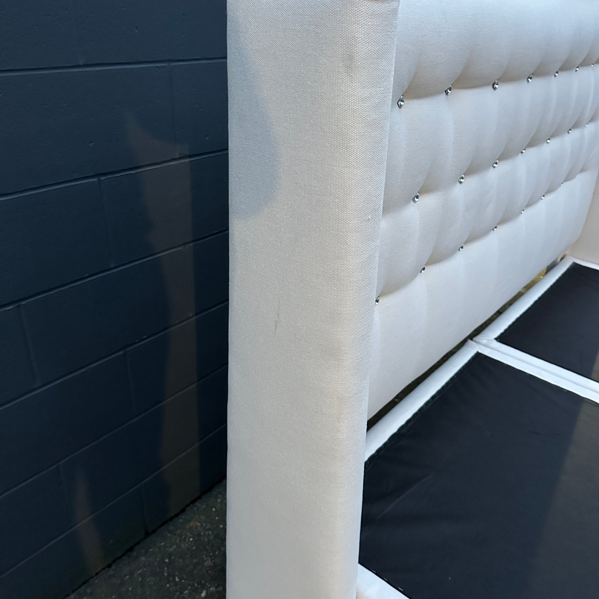 Tufted cream king size bed with headboard and two bases in good condition. Headboard is clean. Small rip on one of the sides of the bases which cannot be seen when covers are on top. Modern style. Legs from the base are removable.